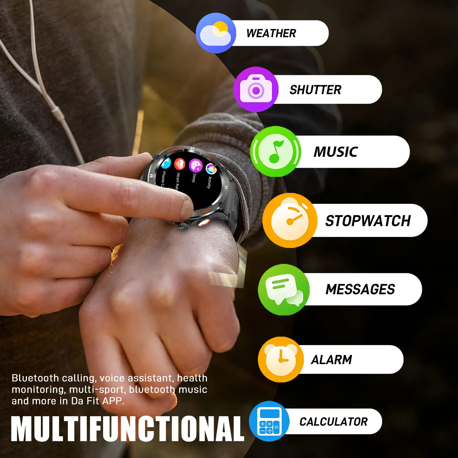 Voice assistant, remote camera, personal business card, world clock, music control, timer, stopwatch, alarm clock, calendar, weather forecast, calculator, etc.