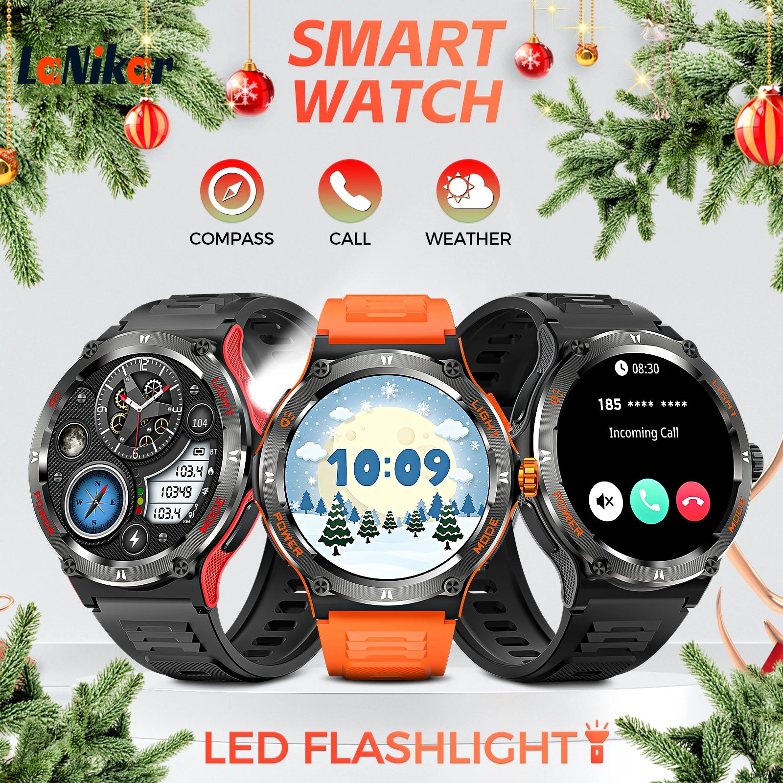 LaNikar Smart Watch 3ATM Waterproof 1.53" New KT76 Men Sport With Compass And LED Flashlight Heart Rate Sleep Analysis Bluetooth